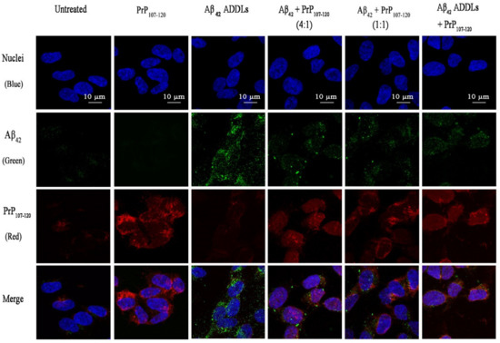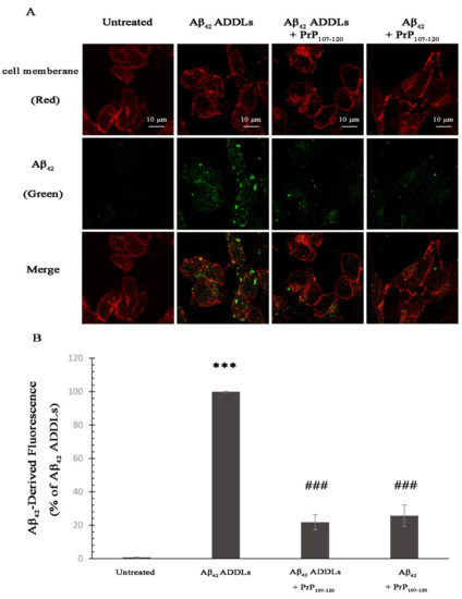 2.7. PrP107-120 Reduces Aβ42 ADDLs Internalization in SH-SY5Y Cells