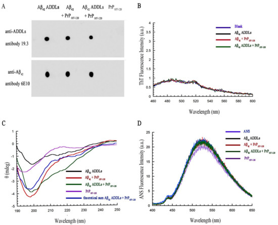 Aβ42 ADDLs did not bind ThT and did not increase its fluorescence, behavior that was not found to be affected by the PrP107–120 peptide (Figure 8B) and suggests that the peptide was not able to change the structure of the ADDLs into a stable and ThT-positive β-sheet structure. Moreover, the CD spectra observed for the Aβ42 + PrP107–120 and Aβ42 ADDLs + PrP107–120 were found to be similar to those resulting from the sum of the spectra of Aβ42 ADDLs alone and PrP107–120 alone, indicating that the PrP107–120 peptide did not significantly change the secondary structure of Aβ42 ADDLs (Figure 8C). Finally, the spectrum of ANS in the presence of Aβ42 ADDLs did not change if the ADDLs were formed in the presence of the peptide (Aβ42 + PrP107–120) or pre-incubated in the presence of the peptide after their formation (Aβ42 ADDLs + PrP107–120), suggesting again that the PrP107–120 peptide was not able to change the Aβ42 ADDL structure (Figure 8D).