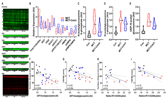 Next, we determined how inhibition of protein O-GlcNAcylation, achieved by colchicine-induced AMPK activation and subsequent GFAT1 phosphorylation, altered RV function. In MCT rats, colchicine treatment increased the ratio of phosphorylated to total AMPK (MCT-Colch: 0.8 ± 0.3 vs. MCT: 0.4 ± 0.2 relative expression compared to control). This was associated with a higher phospho-GFAT1/GFAT1 ratio (MCT-Colch: 0.8 ± 0.3 vs. MCT: 0.5 ± 0.2 relative expression compared to control) (Figure 1A,B). This resulted in a reduction in total O-GlcNAcylation (MCT: 2.0 ± 0.7 vs. MCT-Colch: 1.3 ± 0.4 fold increase compared to control). Importantly, colchicine did not alter the slight upregulation of OGT that was observed in MCT right ventricles (MCT: 1.2 ± 0.3 vs. MCT-Colch: 1.1 ± 0.3 fold increase compared to control). Colchicine treatment induced reductions in right ventricular HBP intermediates (Figure 1C–E), which was associated with improved right ventricular function, evident in the significant negative relationships between right ventricular UDP-GlcNAc levels and cardiac output (r = −0.61, p = 0.0004) and TAPSE (r = −0.52, p = 0.004) (Figure 1F,G). Furthermore, total right ventricular O-GlcNAcylation also displayed significant negative relationships with cardiac output (r = −0.54, p = 0.04) and TAPSE (r = −0.78, p = 0.0007) (Figure 1H,I). These results demonstrate that increased O-GlcNAcylation and HBP intermediate levels in MCT rats were associated with worse right ventricular function, and suggest that the reduction in O-GlcNAcylation and HBP intermediates caused by colchicine treatment helped improve right ventricular function