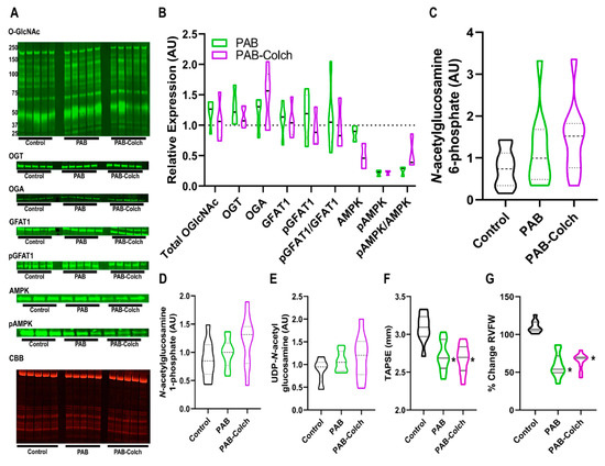 In PAB rats the ratio of phosphorylated GFAT1/GFAT1 was not significantly dysregulated in PAB or PAB-Colch right ventricles (Figure 2A,B). However, colchicine increased the ratio of phosphorylated AMPK/AMPK, but there was a reduction in total AMPK in the colchicine treated group (Figure 2A,B). Consistent with the lack of excess activation of the HBP, colchicine treatment did not alter the levels of HBP intermediates in PAB right ventricles (Figure 2C–E), suggesting GFAT1 activity was not significantly altered in PAB or PAB-Colch right ventricles. Finally, colchicine did not improve right ventricular function in PAB rats (Figure 2F,G). These results show that although colchicine treatment activated AMPK in PAB RVs, it did not augment right ventricular function in a model in which HBP intermediates and O-GlcNAcylation are not dysregulated.