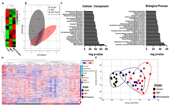 Frozen RV free wall specimens were processed by Metabolon Inc. (Durham, NC, USA) for global metabolomics profiling. For the MCT experiments, control, MCT, and MCT treated with colchicine specimens were analyzed (n = 12 animals per group). For the PAB analysis, sham operated, PAB, and PAB treated with colchicine specimens were analyzed (n = 10 animals per group)