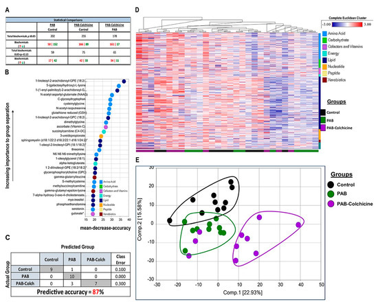 Effect of colchicine treatment on metabolomic signature in PAB rats. (A) Table depicting the overall differences in metabolites in control, PAB, and PAB-Colch right ventricles. (B) Biochemical importance plot revealing the top 30 ranking biochemicals that differentiates experimental groups. (C) Random Forest Confusion Matrix shows analysis of metabolomics data results in an 87% predictive accuracy. (D) Hierarchical clustering analysis of metabolites. (E) Principal component analysis of total metabolomic data reveals colchicine did not normalize the metabolic signature in PAB rats. Tissue was harvested 8 weeks after sham or PAB procedure.