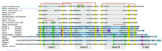 - Vasilyeva, N.A.; Loktyushov, E.V.; Bychkov, M.L.; Shenkarev, Z.O.; Lyukmanova, E.N. Three-Finger Proteins from the Ly6/uPAR Family: Functional Diversity within One Structural Motif. Biochemistry 2017, 82, 1702–1715. [Google Scholar] [CrossRef] [PubMed]