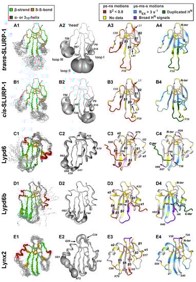 The ms–s timescale conformational fluctuations due to cis-trans isomerization of the Xxx-Pro peptide bonds were observed in the loop II of SLURP-1 and in the C-termini of Lypd6 and Lypd6b.