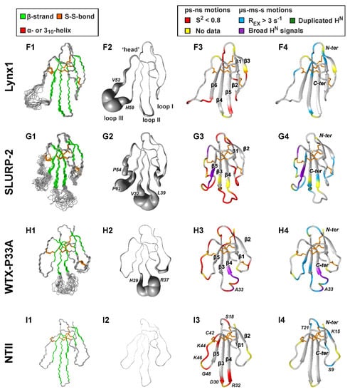 Like SLURP-1 and Lynx2, these molecules involve two antiparallel β-sheets formed by five (SLURP-2, WTX, NTII) or six (Lynx1) β-strands. In the last case, residues of the loop I form three β-strands belonging to two different β-sheets (Figure 2F). There are no helices in the Lynx1, SLURP-2, WTX, and NTII molecules, but all of them (except NTII) contain disordered loops. The significant disorder (RMSD > 2 Å) was observed in the WTX loop II, Lynx1 loop III, and SLURP-2 loops II and III (Figure 3A).