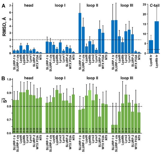 Loops II and III of the studied proteins demonstrate greater mobility at the ps–ns timescale (average S2 ~0.83 and 0.78, respectively) than the loop I and ‘head’ (average S2 ~0.86 and 0.88, respectively) (Figure 3B). Overall, SLURP-1 demonstrates the largest ps–ns mobility among the studied TFPs (average S2~0.80). This correlates with its 3D structure, where the β-strands of the loops II and III are significantly shorter than the overall length of the loop regions (Figure 2A,B). On the other hand, the largest overall stability (the smallest amplitude of motions) at the ps–ns timescale was observed for Lynx1, Lypd6, Lypd6b, and Lynx2 (average S2 0.87–0.90, Figure 3B).
