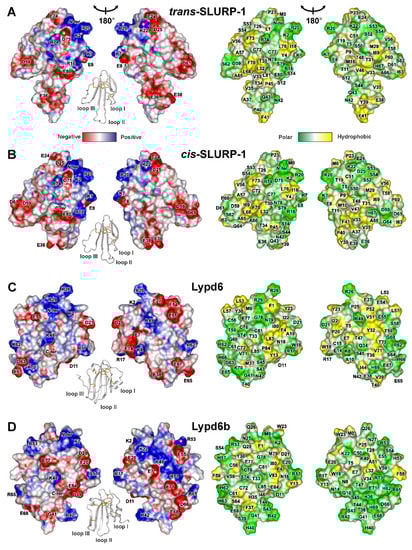 To stimulate further drug development studies, we investigated four human Ly-6/uPAR proteins interacting with nAChRs (Lynx2, Lypd6, Lypd6b, and SLURP-1) by NMR spectroscopy. One of the advantages of NMR is an ability to determine the protein high-resolution 3D structure together with the dynamics. Dynamics and plasticity could be the important determinants of the ligand-receptor interactions. Determined structures of two SLURP-1 isomers (Figure 4A,B) illustrate how the conformational rearrangements can influence the distribution of the functional groups on the protein surface.