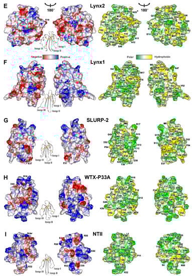 Two-sided view of molecular surfaces of TFPs: (A) trans-Tyr39-Pro40 SLURP-1, (B) cis-Tyr39-Pro40 SLURP-1, (C) Lypd6, (D) Lypd6b, (E) Lynx2, (F) Lynx1, (G) SLURP-2, (H) WTX-P33A, (I) NTII. Electrostatic and molecular hydrophobicity [] potentials are shown. Red, blue, green, and yellow areas denote negative, positive, polar, and hydrophobic regions, respectively. The ribbon representation shown for each protein/isomer corresponds to the left panel. The predicted glycosylation site (Asn23) in the Lynx2 molecule is shown by asterisk.