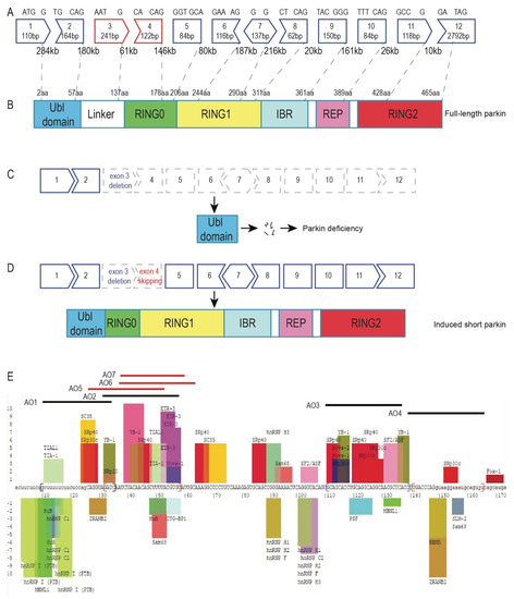 PRKN exon map, parkin protein structure, and the strategy to restore parkin function. (A) PRKN is a large gene spanning around 1.8 Mb of DNA with 12 exons separated by huge introns. (B) Parkin is a RING-between-RING E3 ligase that mainly consists of the ubiquitin-like domain, RING0, RING1, in-between-ring motif (IBR), repressor element of parkin (REP), and the RING2 domain. (C) A PRKN exon 3 genomic deletion disrupts the reading frame and causes parkin deficiency. (D) Skipping exon 4 in patient-derived fibroblasts carrying an exon 3 deletion restores the PRKN reading frame. The induced transcript can be translated into a shorter protein missing a small part of the ubiquitin-like domain, the linker, and a portion of the RING0 domain, but preserving the catalytic RING domains. (E) Exon splicing enhancers and silencers were predicted by SpliceAid [15]. The original image of splicing motifs and sequence information can be found on the SpliceAid website (http://www.introni.it/splicing.html). Initial splice-switching PRKN exon 4 AO sequences (AO 1–4) were designed to target the exon splicing enhancers or exon–intron boundaries. Design of “microwalking” AOs (AO 5–7) was refined from the AO 2 sequence. The splicing enhancer and silencer motifs are shown as coloured bars above and below the sequence, respectively. The height of the bars represents the predicted strength of the motifs. The intronic sequences are shown in lower case and the exonic sequences as upper case.