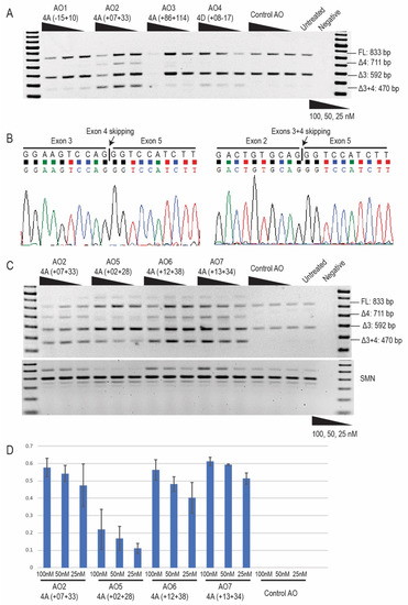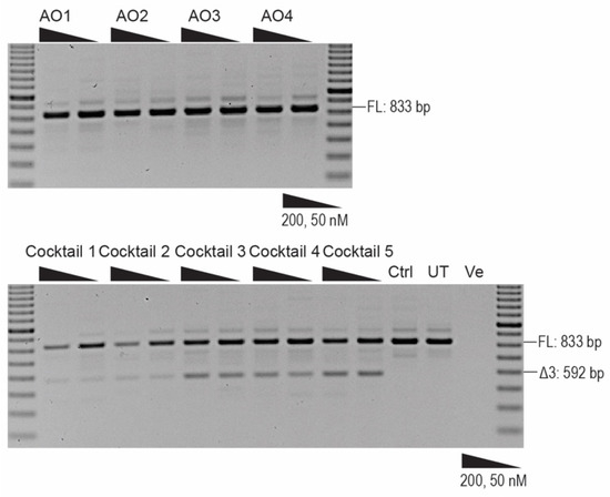 Cells were transfected with 2′OMe PS AO: Lipofectamine 3000 (L3K, 3 µL, Life Technologies) lipoplexes in Opti-MEM (Life Technologies) according to the manufacturer’s instructions, at concentrations of 100, 50, and 25 nM for initial screening. PMO solutions were warmed for 5 min at 37 °C before being transfected into cells with EndoPorter® (Gene Tools) according to the manufacturer’s instructions at the concentration of 20 μM. Culture medium was replaced with fresh 10% FBS DMEM before adding the desired volume of PMO and 3 µL of EndoPorter® for every 500 µL culture medium. Cells were incubated for 24 h for 2′OMe AO transfections and 72 h for PMO transfections before harvesting for RNA extraction.