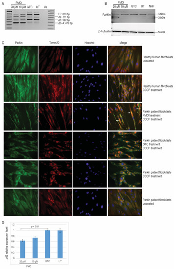 We then evaluated the function of this truncated parkin isoform. It has been reported that functional parkin protein is recruited to the outer membrane of depolarised mitochondria to initiate mitophagy [16,17]. Patient fibroblasts were treated with 20 μM PMO H4A (+13 + 34) for 72 h, followed by depolarisation of the mitochondria by 50 μM carbonyl cyanide m-chlorophenyl hydrazone (CCCP) treatment for two hours. After 50 μM CCCP treatment, cytoplasmic healthy-type parkin protein colocalises with depolarised mitochondria in the perinuclear region, as shown by the colocalisation of parkin and the mitochondria outer membrane protein, Tomm20 (Figure 3C). A similar pattern of parkin protein location was shown in PD patient-derived fibroblasts treated with PMO but was not evident in the GTC PMO-treated or untreated PD patient fibroblasts. Additional figures indicating colocalisation of the truncated functional parkin protein and depolarised mitochondria are shown in Supplementary Figure S3.