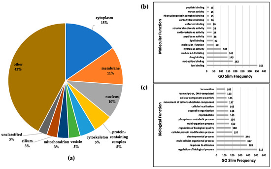 Gene ontology (GO) analysis of the sperm capacitation phosphoproteome. The top 15 selected significant GO slim categories (p-value < 0.05) and the ranked frequencies of GO slim categories within the (a) cellular component, (b) molecular function, and (c) biological process gene ontologies are shown. The analyzed phosphoprotein datasets came from all datasets for the three capacitation times (0, 60, and 90 min).