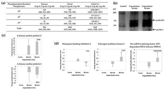 Profiling of protein phosphorylation during mouse sperm capacitation. (a) Numbers of phosphopeptides with probabilities > 0.75 for S, T, and Y phosphorylation identified during different capacitation times (0, 60, and 90 min). (b) Western blot analysis of Y-phosphorylated mouse sperm proteins after different capacitation times (0, 60, and 90 min) with a pY1000 antibody. (c) Label-free quantitation (LFQ) of mouse sperm AKAP4 before or after BSA-induced capacitation. (d) LFQ of phosphopeptide level changes from those at capacitation time zero after BSA-induced capacitation. The normalized ion intensities of Y-phosphorylated phosphopeptides corresponding to identified phosphoproteins are plotted versus capacitation time (X-axis). * indicates significant differences between the changes at time 60 vs. time 90 (p < 0.05).