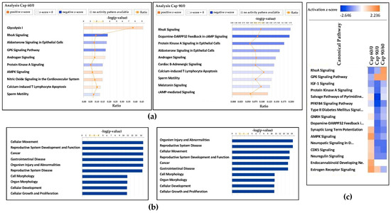 Differential phosphoproteomic analysis using ingenuity pathway analysis (IPA) for the Cap 60/0 and Cap 90/0 datasets. (a) Representative bar chart of the IPA-revealed canonical pathways for the Cap 60/0 and Cap 90/0 datasets. The orange lines represent the ratios of changed genes to the total number of genes in specific pathways. The threshold (set to 1.3) is scored as the −log p-value from Fisher’s exact test and indicates the minimum significance level. The ratio indicates the number of molecules in the dataset that mapped to the pathway listed divided by the total number of molecules that mapped to the canonical pathway within the IPA database. (b) Representative bar charts determined by IPA showing the biological functions associated with the phosphoproteins for the Cap 60/0 and Cap 90/0 datasets. (c) Heatmaps generated through IPA canonical pathway analysis for comparison among all datasets (Cap 60/0, Cap 90/0, and Cap 90/60). Upregulated pathways are shaded orange, and downregulated pathways are shaded blue. The intensity indicates the degree to which each gene was upregulated or downregulated as determined by the IPA-determined z-score.