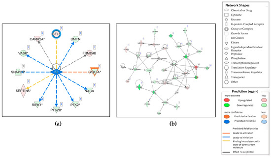 (a) Upstream regulators and their corresponding inhibition as predicted by IPA. F2 was predicted to be inhibited (z-score −2.147 and p-value 0.011). In this picture, activated upstream regulators are highlighted in orange, while inhibited upstream regulators are in blue. Colors in red and green indicated upregulated and downregulated proteins, respectively, and the color depth is correlated to the fold change. Dashed lines with arrows in orange and blue indicate indirect activation and inhibition, respectively. Yellow dashed lines with arrows indicated inconsistent effects, while gray dashed lines with arrows indicated no prediction. (b) IPA-based network of proteins involved in cell signaling, cellular movement, and reproductive system development and function for the Cap 60/0 datasets. In the figure, red represents upregulation and green represents downregulation. The color intensity represents the relative magnitude of the change in protein expression. Direct and indirect interactions are indicated by solid and dashed lines, respectively.