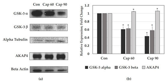 Validation of MS results by western blot analysis for selected proteins. (a) Western blot analysis of GSK-3α, GSK-3β, alpha tubulin, AKAP4, and beta actin in noncapacitated (Con) and capacitated (Cap 60 and Cap 90) mouse sperm. (b) Relative expression of GSK-3α, GSK-3β, and AKAP4, (fold changes). * indicates significant differences compared to control (Con) group of each selected protein (p < 0.05).