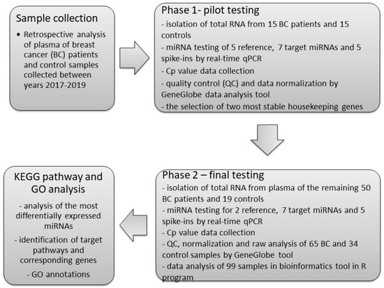 Based on our literature review [10] and our yet unpublished data on breast cancer tissues and circulating miRNA expression, five references [13,14,15,16] and seven target miRNAs [17,18] detectable in plasma were chosen to examine as the most representative biomarkers in plasma of BC patients and control subjects. The process of miRNA profiling consisted of two phases: pilot testing (Phase 1) and final testing (Phase 2). The scheme of the study design is displayed in Figure 1. The quality of total RNA extraction and reverse transcription was checked using synthetic spike-ins. Overall, 65 patients with breast cancer and 34 healthy control subjects without any history of malignancy were tested in both experiments.