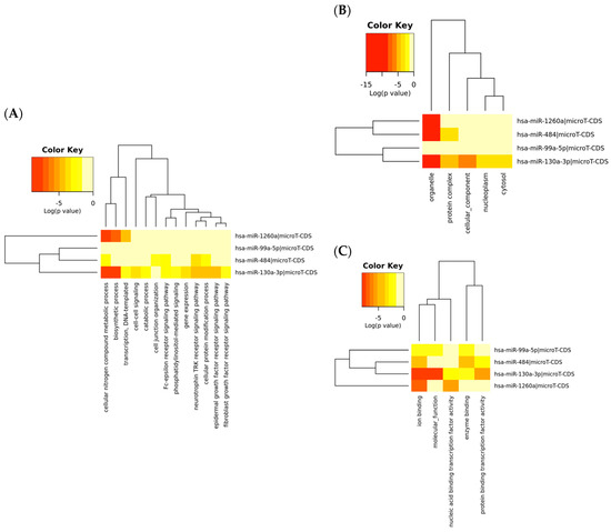 Heatmaps of the Gene Ontology (GO) analysis. GO enrichment of putative targets was performed for four significantly up-regulated miRNAs at three levels: (A) biological process, (B) cellular component and (C) molecular function. Different colours represent different levels of pathway term enrichment in the miRNA target genes. Red indicates a higher degree of enrichment.