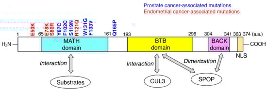 Domain structure of human speckle-type Bric-à-brac/Tramtrack/Broad complex (BTB)/POZ protein (SPOP) predicted by the Pfam database (https://pfam.xfam.org). Substrates of the cullin-3 (CUL3)/SPOP E3 complex directly bind to meprin and TRAF-C homology (MATH) domain of SPOP. The BTB domain of SPOP is responsible for the interaction with CUL3 and SPOP dimerization. BTB and C-terminal Kelch (BACK) domain is also required for SPOP dimerization. Representative missense mutations detected in prostate cancers and endometrial cancers are indicated in blue and red, respectively. The numbers in the domain structure represent the order of amino acids. The nuclear localization sequence (NLS) is also shown.
