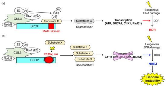 Patho-physiological roles of SPOP during the DNA damage response (DDR) in response to exogenous DNA damages. SPOP is essential for the mRNA expression of various DNA repair-related genes (ATR, BRCA2, ChK1, Rad51). (a) In cells expressing wild-type SPOP, ubiquitination of unidentified substrates promotes transcription of ATR, BRCA2, ChK1 and Rad51 leading to the proper DDR followed by error-free homology-directed repair (HDR) in response to exogenous DNA damages. (b) In cells expressing the F133V mutant of SPOP, inhibition of ubiquitination of substrates suppressed transcription of ATR, BRCA2, ChK1 and Rad51. Low expression of those genes promotes NHEJ after exposure to exogenous DNA damage leading to the generation of genome instability.