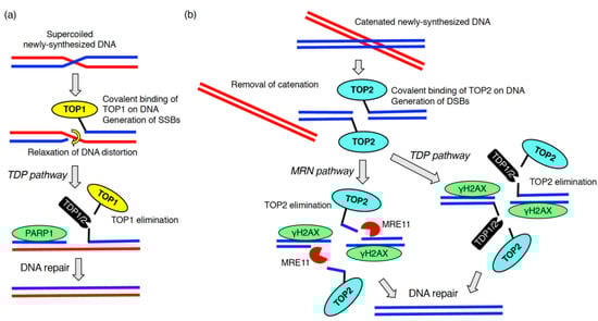 DNA replication is an essential process for all living organisms. During the replication, aberrant replication forks with uncoupled helicases and DNA polymerases are often generated. This complex phenomenon is defined as DNA replication stress [65]. The stalled replication forks lead to the formation of stretches of single stranded DNA, which is recognized by RPA followed by the activation of ATR [66]. DNA replication stress arises from a number of sources (e.g., lack of nucleotides, DNA lesions including DNA–protein adducts, DNA secondary structure, ribonucleotide incorporation) [65]. The generation of newly synthesized DNA chains in the S phase inevitably results in some endogenous DNA damage [67]. During this process, DNA replication stress caused by distortions in newly replicated DNA (e.g., supercoiled and catenated DNAs) is problematic [68]. To relieve these topological problems within DNA chains, topoisomerase 1 (TOP1) and topoisomerase 2 (TOP2) covalently bind to DNA leading to the formation of DNA–protein crosslinks (also called DNA–protein adducts) (Figure 3) [69,70]. TOP1 and TOP2 introduce SSBs and DSBs, respectively, resulting in the removal of supercoiled and catenated DNAs (Figure 3) [69]. After the resolution of DNA replication stress, TOP1 and TOP2 must be dissociated from the DNA–protein crosslink so proper DNA repair of the SSBs and DSBs can take place (Figure 3) [71]. This process is called DNA–protein crosslink repair [70]. During DNA–protein crosslink repair, the tyrosyl-DNA phosphodiesterase 1 (TDP1) or TDP2 eliminates TOP1 or TOP2 from the DNA–protein adducts. These enzymes cleave phosphotyrosyl bonds between the DNA and the tyrosine residue of TOP1 or TOP2, respectively (Figure 3) [69]. The endo/exonuclease, MRE11, which forms a complex with Rad50 and NBS1, also removes TOP2 from the DNA–protein adducts (Figure 3) [70]. MRE11 knockout increased the amount of the TOP2A-DNA cleavage complex [72].