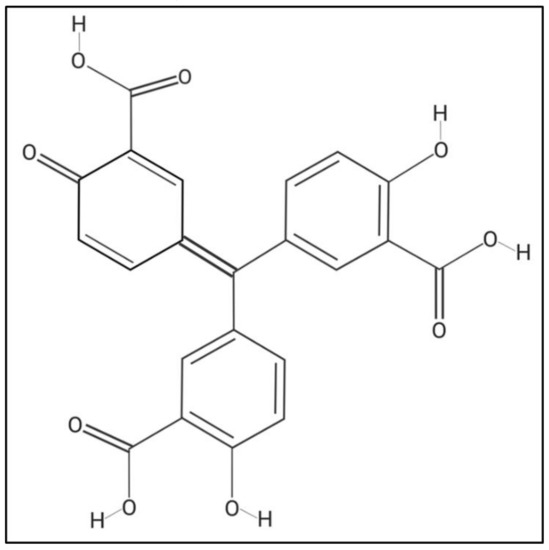 Chemical structure of aurintricarboxylic Acid (ATA). Molecular weight = 422.3 g/mol. Compound ID in PubChem 2259.