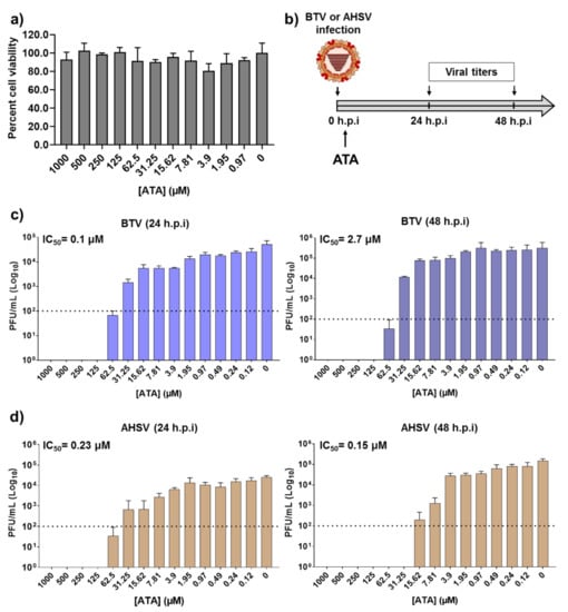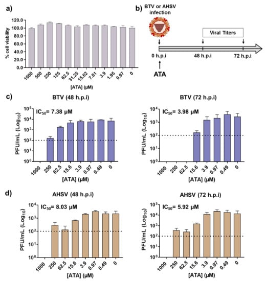 Inhibition of Bluetongue virus (BTV) and African horse sickness virus (AHSV) by ATA. (a) Cytotoxicity of ATA. Vero cells were treated with the indicated doses (two-fold dilutions, starting concentration 1000 μM) of ATA. Cell viability was analyzed at 24 h after treatment. Data are expressed as mean and SD. (b) Schematic representation of the experimental design. Vero cells were infected (multiplicity of infection (MOI), 0.01) with BTV-4 (c) or AHSV-4 (d), and after 90 min of viral adsorption, the indicated concentrations (two-folds dilutions, starting concentration 1000 μM) of ATA were added to the infection media (0 h.p.i.). At 24 (left) and 48 (right) h post-infection (h.p.i)., tissue culture supernatants were collected for virus titration by the plaque assay. The IC50 is indicated. Data are expressed as mean and SD. Dotted lines indicate the limit of detection.