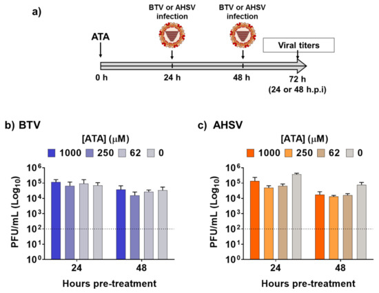 Pre-treatment with ATA did not prevent infection by BTV or AHSV. (a) Schematic representation of the experimental design. Vero cells were pre-treated with the indicated concentrations of ATA for 24 or 48 h before infection (MOI, 0.01) with BTV (b) or AHSV (c). At 24 h.p.i, tissue culture supernatants were collected for virus titration by the plaque assay. Data re expressed as mean and SD. Dotted lines indicate the limit of detection.