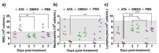 Toxicity of ATA in uninfected mice. Evaluation of blood parameters in samples taken from IFNAR (−/−) mice treated with ATA (red), DMSO (green), and PBS (purple) to determine the number of white blood cells (WBC) (a), neutrophils (Neu) (b), and lymphocytes (Lym) (c). Samples were evaluated with a multiparameter autohematology analyzer at 3 and 7 days post-treatment. * p < 0.05, ** p < 0.005, *** p < 0.0005, using two-way ANOVA. Horizontal lines indicate the means. Gray shadows indicates reference values for selected hematological parameters.