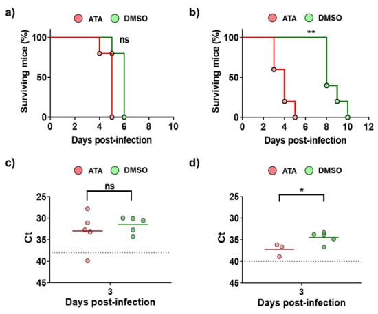 Next, antiviral studies were conducted in mice infected with BTV-4 or AHSV-4 (Figure 5). To that end, IFNAR (−/−) mice were divided in four groups: groups 1 and 3 were treated with 600 µg of ATA dissolved in PBS, and groups 2 and 4 (controls) were administered DMSO dissolved in PBS. Inoculations were carried out for eight days or until the mice died, starting one day before infection. Groups 1 and 2 were subcutaneously infected with BTV-4 (10 PFU/mouse), and groups 3 and 4 were subcutaneously infected with AHSV-4 (5 × 105 PFU/mouse). Mortality and the appearance of clinical signs were evaluated daily. The treatment with ATA did not prevent death of the animals infected with BTV-4 (Figure 5a), and usually animals that received the drug died earlier, although differences were not significant. This pattern was most evident for AHSV-4, as mice in the control group succumbed to infection about five days later than animals treated with ATA (Figure 5b). The observation of clinical signs of infection correlated with the mortality rates. To evaluate viral replication, the presence of the virus in the blood was measured by RT-qPCR at 3 d.p.i (Figure 5c,d). Contrary to what was expected based on the observed mortality rates, in general, animals in control groups, which were not treated with ATA, showed higher levels of viremia for AHSV-4 (Figure 5d). However, differences were not observed between groups of mice inoculated with BTV (Figure 5c). These results suggest that ATA could be able to inhibit viral infection in IFNAR (−/−) mice. However, due to the observed toxic effect of ATA in vivo (Figure 4), which jeopardizes the physiology and immune response of animals, this compound is not a therapeutic option, at least in the current formulation.