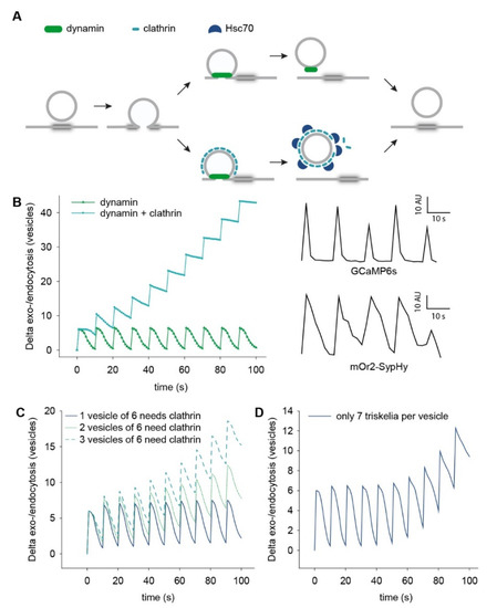 Simulations of the usage of three endocytosis cofactors during spontaneous network activity, (A), models of endocytosis tested in the simulations. To be endocytosed, each vesicle either needs to accumulate a sufficient number of dynamin molecules, which are quickly released after endocytosis, or, in addition to dynamin, a full clathrin coat is also required, which is then removed by Hsc70. (B), Results of the simulations showing the difference between the number of exo- and endocytosed vesicles in both of the tested hypotheses. Dynamin is supplied in necessary copy numbers, and can be involved in endocytosis at every step, while in the case of an absolute requirement for clathrin, endocytosis does not balance exocytosis. The inset to the right shows an indication of the spontaneous network activity modeled here, in the form of fluorescence intensity changes of a calcium sensor (GCaMP6s, top), and of a vesicle endo-/exocytosis indicator (mOr2-SypHy, bottom) recorded in live boutons during spontaneous activity. For the full statistics of such measurements, see [47]. (C), We tested whether endocytosis can balance exocytosis when only a fraction of the released vesicles require a full clathrin coat. When one vesicle out of six required clathrin, exo- and endocytosis are balanced reasonably well. (D), Exo- and endocytosis can also not be balanced when as few as seven triskelia are required for each vesicle. The models were performed based on data obtained in cultured rat hippocampal neurons, as indicated in the main text.
