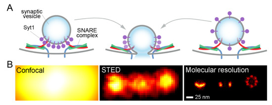 To showcase this, in the following we turn again to synaptic vesicle proteins, as an example. Synaptic exocytosis needs to take place with sub-millisecond kinetics, for accurate neurotransmission. These kinetics are difficult to understand, because the SNARE proteins responsible for exocytosis “intrinsically operate on a timescale of about a second” [53]. The solution can only come from a special arrangement (organization) of SNAREs and related proteins. For example, the Ca2+ sensor synaptotagmin-1 has been proposed to form a ring-like arrangement at the interface between docked synaptic vesicles and the plasma membrane, which helps in modulating the exocytosis kinetics [53]. Other vesicle proteins may also be arranged in clusters or ring-like arrangements that may aid in exocytosis. These include the SNARE synaptobrevin2/VAMP2, or synaptophysin, a vesicle marker with four transmembrane domains [54]. Vesicle protein clusters have also been proposed to aid in endocytosis [1,2,3]. The clusters are presumably targeted and retrieved by the endocytosis machinery, and, if the vesicle proteins were unable to form clusters, they would eventually scatter on the plasma membrane after exocytosis, and would be much more difficult to sort, retrieve, and endocytose. Albeit attractive, this idea of the involvement of vesicle protein clusters in exo- and endocytosis has one major fallacy; sub-vesicular protein clusters have never been seen in real vesicles, with only some hints obtained so far from electron cryo-tomography [54,55,56]. The main reason is the insufficient imaging resolution (Figure 3), since commonly-used super-resolution approaches are simply unable to differentiate between these hypotheses.