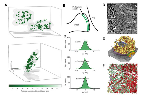 Study of neuronal architecture by maximally informative luminescence excitation (MINFLUX) and cryo-electron tomography (cryo-ET). (A), MINFLUX images of the post-synaptic scaffold protein PSD95. The color maps indicate the 3D density of the molecules. The gray areas are curved surfaces on which the molecules lie. The molecules were directly bound to a chemical fluorophore. (B), Theoretical organization of the molecule. (C), Histograms of localization precision for the molecules shown in panel A, indicating an overall precision of 2.0–2.7 nm. Reproduced from [89]. (D) Tomographic slice showing presynaptic short filaments that link synaptic vesicles to each other (“connectors”; black arrowhead in top inset) or to the active zone (“tethers”; white arrowhead in bottom inset). The insets show the same vesicles on different tomographic slices. MT: microtubule, PSD: postsynaptic density, SC: synaptic cleft, SV: synaptic vesicle. Scale bars: 100 nm main panel, 50 nm insets. (E) 3D segmentation of a presynaptic terminal showing synaptic vesicles (gold), the presynaptic membrane (purple), densities present in the synaptic cleft (light green), the postsynaptic density (orange), a microtubule (dark green), and a mitochondrion (light blue). Connectors (red) and tethers (blue) were detected automatically [90]. (D,E) are reproduced from [91]. (F) 3D segmentation of a neuronal c9orf72 poly-GA aggregate (red) and different macromolecules including ribosomes (yellow), TRiC (purple), and proteasomes (green). Reproduced from [92].
