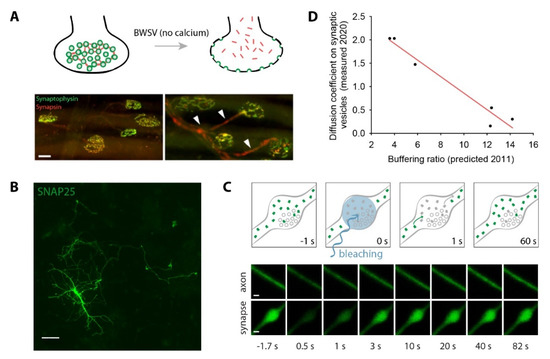 However, a recent observation suggests that synapse heterogeneity may not be as much of a problem as one may envision. Two papers studied the dynamic organization of proteins in rat hippocampal synapses, in culture and in mouse neuromuscular synapses, at an interval of almost a decade [30,33]. The first study investigated the strength of the association between soluble synaptic proteins and synaptic vesicles by perturbing the synaptic vesicles using black widow spider venom, which, when applied in the absence of Ca2+, causes massive exocytosis in the absence of endocytosis, thereby depleting the vesicle clusters [99]. Soluble proteins binding the vesicle cluster diffused out into the axon (Figure 6A), which enabled an estimation of the buffering of proteins by the synaptic vesicles. The more recent study expressed proteins in hippocampal neurons in culture and employed fluorescence recovery after photobleaching (FRAP) to obtain estimates of their movement (Figure 6B,C). The movement, both within the synapses and in the vesicle cluster, was estimated, and the diffusion coefficients of proteins among the vesicles were determined. Importantly, a strong correlation between the estimates obtained in the mouse neuromuscular synapses and in the hippocampal cultures was obtained (Figure 6D).
