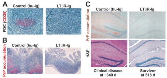 Oral prion disease pathogenesis is impeded in the transient absence of follicular dendritic cells (FDC) at the time of infection []. (A) Immunohistochemical (IHC) analysis shows that the treatment of mice with a soluble lymphotoxin β receptor (LTβR-Ig) transiently ablates FDC (CD35+ cells, red) in secondary lymphoid tissues. (B) Prion accumulation (here shown as disease-specific PrP accumulation by IHC, red) is blocked in Peyer’s patches in the absence of FDC at the time of oral prion infection. (C) Oral prion disease susceptibility is blocked in the absence of FDC at the time of oral prion infection. Upper images show IHC detection of disease-specific PrP (brown) and lower H&E-stained panels show presence of prion disease-specific vacuolation (spongiform pathology) in the brains of clinically-affected control mice. All sections counterstained with haematoxylin (blue). Adapted with permission from the American Society for Microbiology from [] (J. Virol. 2003; 77:6845–6854. https://doi.org/10.1128/JVI.77.12.6845-6854.2003).