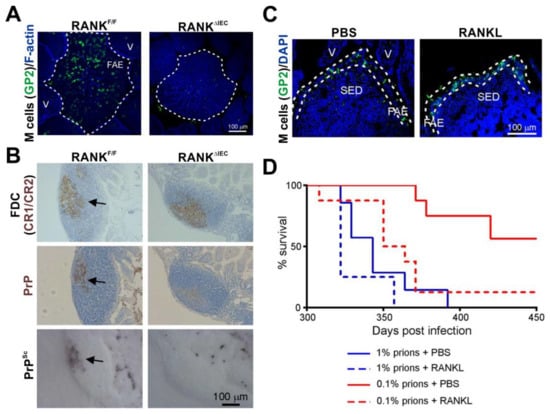 The density of M cells in the epithelia covering the Peyer’s patches directly influences oral prion disease susceptibility []. (A) Immunofluorescence microscopy shows that RANKΔIEC mice specifically lack M cells (GP2+ cells, green) in the follicle-associated epithelia (FAE) of their Peyer’s patches. F-actin, blue. V, villus. (B) In the absence of M cells the accumulation of prions (PrPSc, black and PrP, brown, arrows) upon FDC (CR1/CR2+ cells, brown) in the Peyer’s patches of RANKΔIEC mice is blocked. (C) Immunofluorescence microscopy shows that systemic treatment of C57BL/6J mice with the cytokine RANKL increases the abundance of M cells (GP2+ cells, green) in the FAE. DAPI, cell nuclei, blue. SED, subepithelial dome. (D) RANKL treatment significantly increases susceptibility to oral prion infection by ~10X. PBS/1% vs. RANKL/1%, p = 0.120; PBS/0.1% vs. RANKL/0.1%, p < 0.0078; PBS/1% vs. RANKL/0.1%, p = 0.205; Log-rank [Mantel–Cox] test). Adapted from [] under the terms of the Creative Commons Attribution Licence (CC-BY-4.0; https://creativecommons.org/licenses/by/4.0/).