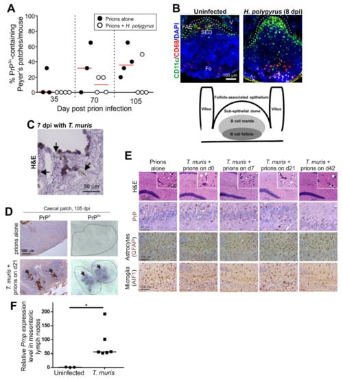 Effect of co-infections with gastrointestinal helminths on oral prion disease pathogenesis in.mice. Panels A and B illustrate the effects of co-infection with Heligmosomoides polygyrus in the small intestine []. C57BL/6J mice were first orally-infected with H. polygyrus. L3 larvae and orally infected with ME7 scrapie prions 8 days later. (A) The frequency of PrPSc-containing Peyer’s patches was lower in mice co-infected with H. polygyrus. (B) Immunofluorescent analysis showed that the distribution of CD11c+ mononuclear phagocytes (green) was disturbed in the Peyer’s patches on d 8 after H. polygyrus infection. FAE, follicle-associated epithelium; SED, subepithelial dome; Fo, follicle; V, villus; dpi, days post-infection. Cartoon shows the anatomical boundaries in the Peyer’s patch. Panels C-E illustrate the effects of co-infection with Trichuris muris in the large intestine []. C57BL/6J mice were first orally-infected T. muris infective eggs and orally infected with ME7 scrapie prions and the days indicated after the helminth infection. (C) Arrows show the close association of T. muris with the caecal epithelium and lamina propria and the damage caused to the epithelium. (D) In mice infected with prions alone PrPSc was undetectable in the caecal patches at 105 dpi. However, high levels of PrPSc were detected in the caecal patches of the mice co-infected with T. muris. (E) High levels of prion-specific vacuolation (H&E), PrP accumulation, reactive astrocytes (GFAP+ cells, brown) and active microglia (AIF1+ cells, brown) were detected in the brains of mice from each infection group. Counterstain, haematoxylin, blue. (F) Upregulated Prnp expression in the mesenteric lymph nodes of T. muris-infected mice. *, p < 0.05. Panels A and B are adapted from [] under the terms of the Creative Commons Attribution Licence (CC-BY-4.0; https://creativecommons.org/licenses/by/4.0/). Panels C–E are adapted from [] under the terms of the Creative Commons Unported Licence (CC-BY-3.0; https://creativecommons.org/licenses/by/3.0/).