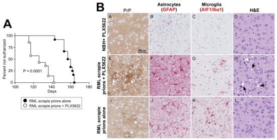 Accelerated CNS prion disease in the absence of microglia. (A) Survival curve shows enhanced onset of clinical prion disease in mice treated with the CSF1R-targeting kinase inhibitor PLX5622. (B) Immunohistochemical analysis shows increased PrP accumulation (brown), reduced abundance of microglia (AIF1/Iba1+ cells, red), increased reactive astrocyte activation (GFAP+ cells, red) and prion-specific vacuolation (arrows, H&E panel) in PLX5622-treated mice at 100 days after IC injection with RML prions. Adapted with permission from the American Society for Microbiology from [] (J. Virol. 2018;92:e00549-18, https://doi.org/10.1128/JVI.00549-18).