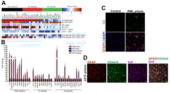 Induction of a mixed A1 neurotoxic and A2 neuroprotective reactive astrocyte phenotype during CNS prion disease. (A) Systemic LPS treatment induces an A1 neurotoxic transcriptional signature in reactive astrocytes in the brain. In microglia-deficient Csf1r−/− mice the LPS-mediated induction of A1 neurotoxic reactive astrocytes is blocked. However, A1 neurotoxic reactive astrocytes are still induced after microglia-depletion by PLX-3397 treatment (~95% reduction) []. (B) A mixed A1 neurotoxic and A2 neuroprotective reactive astrocyte transcriptional signature was observed in the reactive astrocytes in the brains of wild-type (WT) mice terminally affected with RML prions. Deficiency in the microglial-derived factors TNF-α, IL-1α and C1qa (TKO) had little influence on the induction of this response []. (C) Immunofluorescence microscopy shows that GFAP+ (red) reactive astrocytes express high levels of complement component C3 (green) in the prion disease-affected brain []. Nuclei detected with DAPI (blue). (D) Immunofluorescence microscopy shows that GFAP+ (red) reactive astrocytes with abundant disease-specific PrP (magenta) express high levels of CD44 variant 6 (green) in the prion disease-affected brain []. Panel A is adapted from [] with permission from the Nature Customer Service Centre GmbH (Liddelow SA et al. Neurotoxic astrocytes are induced by activated microglia. Nature 2017;541:481-487, https://doi.org/10.1038/nature21029). Panels B and C are adapted from [] under the terms of the Creative Commons Licences (CC-BY-4.0; https://creativecommons.org/licenses/by/4.0/, and CC0-1.0; https://creativecommons.org/publicdomain/zero/1.0/). Panel D is adapted from [] under the terms of the Creative Commons Attribution Licence (CC-BY-4.0; https://creativecommons.org/licenses/by/4.0/).