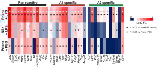 Systemic LPS treatment elevates the expression of pan-, A1 neurotoxic- and A2 neuroprotective reactive astrocyte-associated genes in the hippocampus of mice infected with ME7 scrapie prions. Analysis of a published microarray dataset (NCBI GEO accession no: GSE23182; []) of the effects of LPS treatment on astrocyte-associated gene expression in the brains of mice infected with prions. Mice were systemically injected (IP) with at 18 weeks post-IC injection with prions. Hippocampi were removed 6 h later and gene expression compared by microarray. Parallel sets of mice were injected with PBS or normal brain homogenate (NBr) as controls. Heatmap shows log2 fold change when compared to uninfected control mice injected with PBS. n = 3 mice/group.