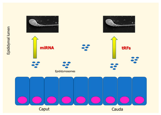 Interestingly, SPRNAs have been found to influence the content of sperm RNA. Particularly, epididymosomes are extracellular vesicles released by the epididymal epithelium, which encapsulate a macromolecular complex made up of proteins (required to avoid RNA degradation) and RNAs. During the sperm transit into the epididymis, epididymosomes interact with spermatozoa by modulating their RNA profile [11]. In more detail, while miRNAs are the most represented class of sRNA in the caput epididymis, tRFs are more abundantly found in the cauda [16,17]. During the epididymal transit, sperm miRNAs account for 50% of the global sRNA in the caput epididymis to the 16% in the cauda epididymis. By contrast, sperm tRF account for 24% to 65% in the caput and in the cauda epididymis, respectively [16,17]. Similarly, sRNA content of epididymosomes varies from the caput to the cauda region (Figure 1). This confirms that the content of sperm RNAs is modulated during the epididymal transit: spermatozoa are enriched of miRNAs in the caput, whereas they are enriched of tRFs in the cauda. This is notable, since the RNA placed in the caput epididymis (which is a component of the SP) is required for oocyte fertilization. Accordingly, a study in mice showed that spermatozoa retrieved from the caput epididymis is unable to penetrate the oocyte. It becomes competent for fertilization only by the addiction of RNAs of the cauda [16]. This evidence suggests a role of SP transcriptome in human fertility. The results coming from human transcriptome studies in fertile men and infertile patients are discussed below.