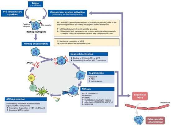 Kessenbrock et al. showed that neutrophil extracellular traps (NETs) are released by ANCA-stimulated neutrophils and contain the respective target antigens PR3 and MPO. They further demonstrated that the deposition of NETs in affected organ systems contributes to the damage observed in cases with ANCA-associated vasculitis [23]. NET components are capable of activating dendritic cells and in turn inducing autoimmunity, leading to ANCA production [24,25].