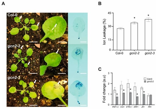 AtGCN2 participates in the defense response to Botrytis cinerea. (A) Representative disease symptoms in 3-week-old seedlings from Col-0 (WT) and gcn2-2 (SALKseq_032196) and gcn2-3 (SALKseq_129334) mutants at 3 dpi (right panel). For each experiment, two leaves from each plant were inoculated with 5 µL of a Botrytis suspension (5 × 106 spores/mL). Close-up views of a representative B. cinerea infected leaf from each genotype (middle panel). In these two panels, lesions are highlighted with white arrows. Representative cell death symptoms on leaves detected by Trypan blue staining (right panel). Scale bars correspond to 1 cm in the left panel and 0.25 cm in the middle and right panels. These experiments were repeated independently at least three times, obtaining similar results. (B) Analysis of ion leakage from infected leaves of the same lines at 3 dpi. The percentage of ion leakage upon Botrytis inoculation is related to the total conductivity of the leaves after membrane and wall breakdown. n = 6 independent experiments including 10 leaves per genotype. Statistical differences (* p ≤ 0.05) are highlighted by asterisks. (C) qRT-PCR analysis of AtPDF1.2, AtCOI1, AtETR2.1, AtERF1, AtJR1, and AtPR1 transcription levels at 1 dpi. Fold change expression is related to the expression of each gene in the corresponding genotype under control conditions (i.e., in the absence of fungus), which was arbitrarily assigned value 1 after normalization to β-ACTIN (internal normalization control). In this case, three biological replicates were analyzed. For (B and C), values are shown as mean ± SEM. In both cases, statistically significant differences (* p < 0.01) were calculated using one-way ANOVA test.