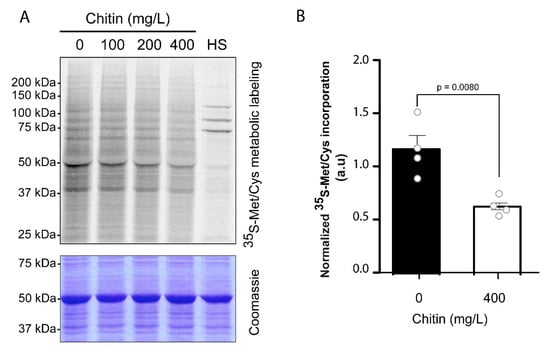 Thus, in order to investigate whether chitin perception leads to a global effect on plant translation, Arabidopsis seedlings were treated with different concentrations of chitin, and subsequently, the seedlings were labeled with 35S-Methionine 35S-Cysteine. After labeling, equal amounts of total protein were loaded in a gel and run. The gel was subjected to Coomassie staining (Figure 3A, lower panel, provided as loading control) and 35S-Methionine 35S-Cysteine incorporation into the de novo synthesized proteins was analyzed by autoradiography (Figure 3A, upper panel). As positive control, we also monitored protein synthesis in seedlings subjected to heat stress, a treatment that promotes a drastic inhibition of protein translation [1]. As shown in Figure 3A, upper panel, chitin induced a reduction in the global protein synthesis that was enhanced at higher concentrations of chitin. In the case of the treatments carried out at 400 mg/L chitin, the reduction in de novo protein synthesis was quantified (Figure 3B). This analysis indicates that chitin promotes a significant reduction in the de novo protein synthesis.