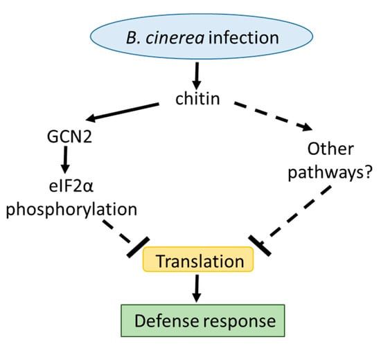 Translation plays an important role in plant adaptation to different abiotic and biotic stresses; however, the mechanisms involved in translational regulation during each specific response and their effect in translation are poorly understood in plants. In this work, we show that GCN2 promotes eIF2α phosphorylation upon contact with Botrytis cinerea spores, and that this phosphorylation is required for the proper establishment of plant defense against the fungus. In fact, independent gcn2 mutants display an enhanced susceptibility to B. cinerea infection, which is highlighted by an increased cell death and reduced expression of ethylene- and jasmonic-related genes in the gcn2 mutants. eIF2α phosphorylation is not only triggered in the presence of the fungus, but interestingly, is also achieved in the sole presence of the microbe-associated molecular pattern (MAMP) chitin. Moreover, analysis of de novo protein synthesis by 35SMet–35SCys incorporation indicates that chitin treatment promotes a global inhibition of translation. Taken together, these results suggest that eIF2α phosphorylation by GCN2 is promoted in the presence of chitin and plays an important role in plant defense against B. cinerea infection.