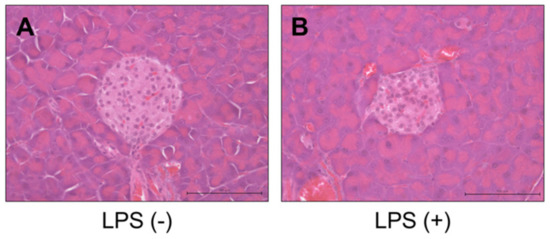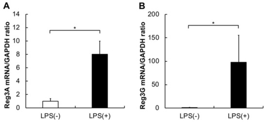 The expression levels of Reg3A and G were significantly higher in the pancreas of mice administered with LPS when compared to those in the controls (Figure 1A,B; *p < 0.05).
