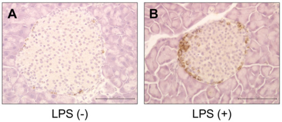 Immunohistological staining for Reg3A/G in the P. gingivalis lipopolysaccharide (PG-LPS) and control mice. Strongly positive staining for Reg3A/G was observed in the islets of Langerhans in the LPS-administered mice. Scale bar, 100 µm. (A) PG-LPS(−). (B) PG-LPS(+).