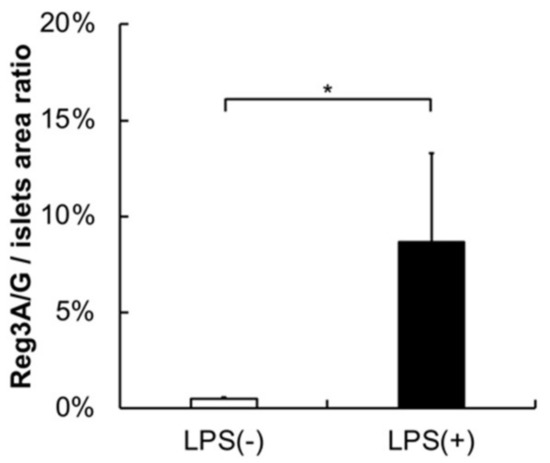 Reg3A/G/Islets area ratio from image analysis. Image analysis showed that the ratio of Reg3A/G-positive cells was significantly higher in the PG-LPS group than the control. Data are shown as mean ± standard deviation (SD), Mann–Whitney U test (* p ˂ 0.05; n = 5).
