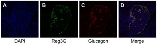 Immunochemical staining for Reg3A/G and alpha-cell in the P. gingivalis lipopolysaccharide (PG-LPS) mice. Immunofluorescence staining showed the presence of Reg3A/G-positive cells in the alpha-cell equivalent areas around the islets of Langerhans in the PG-LPS group. (A) 4′,6-diamidino-2-phenylindole (DAPI). (B) Reg3A/G. (C) Glucagon. (D) Merge.