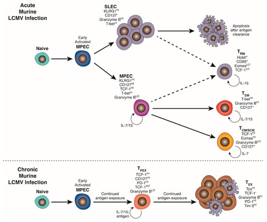 Within the first 4–5 days of acute LCMV Armstrong infection, activated CD8+ T cells uniformly acquire effector characteristics, including cytotoxic capacity and IFNγ production, but can be phenotypically partitioned into KLRG1neg CD127+ memory precursor effector cells (MPEC) and KLRG1HI CD127neg/LO short-lived effector cells (SLEC) [27,28,29]. This distinction is mediated by a complex spectrum of transcription factor interactions, and regulated by strength of TCR-mediated signalling, metabolic profile and inflammatory cytokine exposure (for instance IL-12), discussed in further detail in Section 4 and Section 5. [28,30,31] SLEC briefly retain responsiveness to survival signals from IL-15, but are chiefly reliant on continued antigen exposure for their survival, and have been shown to contract mainly by apoptosis after viral clearance, following kinetics programmed during their initial priming [32,33]. MPEC retain responsiveness to both IL-15 and IL-7 and are not reliant on antigen encounter for survival. These cells persist in SLO after differentiation into long-lived but poorly cytotoxic central-memory (TCM) and stem-like memory (TSCM) cells capable of robust secondary expansion, and in peripheral tissues and circulation as effector memory cells (TEM) retaining both proliferative and cytotoxic capacity, governed by patterns of chemokine receptor and adhesion molecule expression. Although IL-7Rα(CD127) expression and IL-7 responsiveness are crucial for the survival of memory T cells, IL-7 signalling alone is not sufficient for an MPEC—memory transition, as overexpression of CD127 in KLRG1+ SLEC does not protect them from contraction [34]. Interestingly, recent cell fate tracking studies suggest that a small proportion of KLRG1+ SLEC exposed to intermediate levels of initial stimulation may downregulate KLRG1 while retaining high cytotoxic capacity and contribute to a pool of peripheral tissue resident memory T cells (TRM) [35].